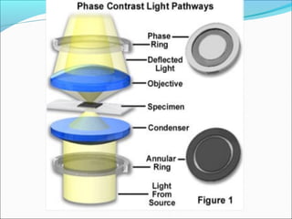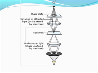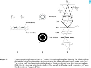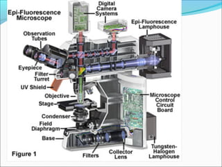 The document is a detailed overview of the components and principles of optical microscopes, discussing parts such as the eyepiece, objective lenses, and focus knobs, as well as the processes of magnification and resolution. It explains various types of microscopy techniques, including bright field, phase contrast, and fluorescence microscopy, and highlights the importance of proper illumination and maintenance of the microscope for effective observation. Additionally, it addresses the characteristics and costs associated with different objective lenses, particularly achromat and apochromat lenses.