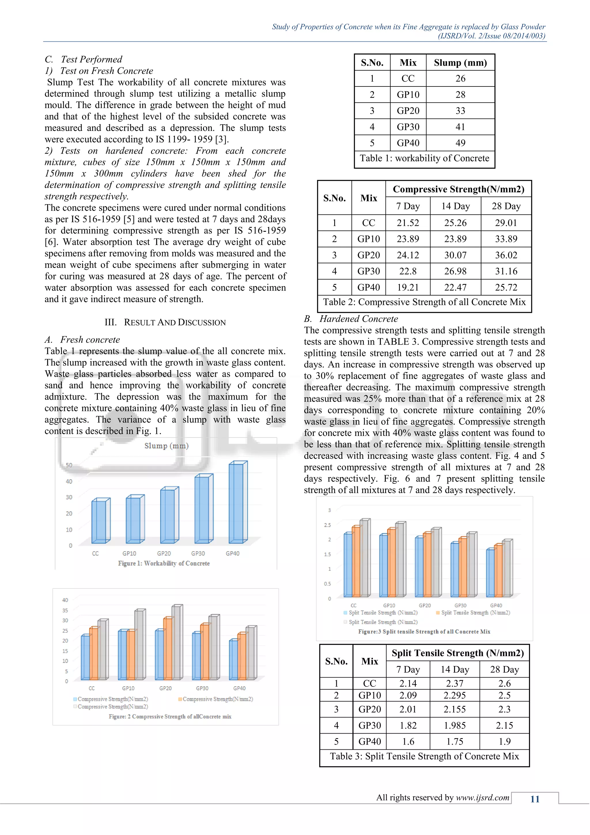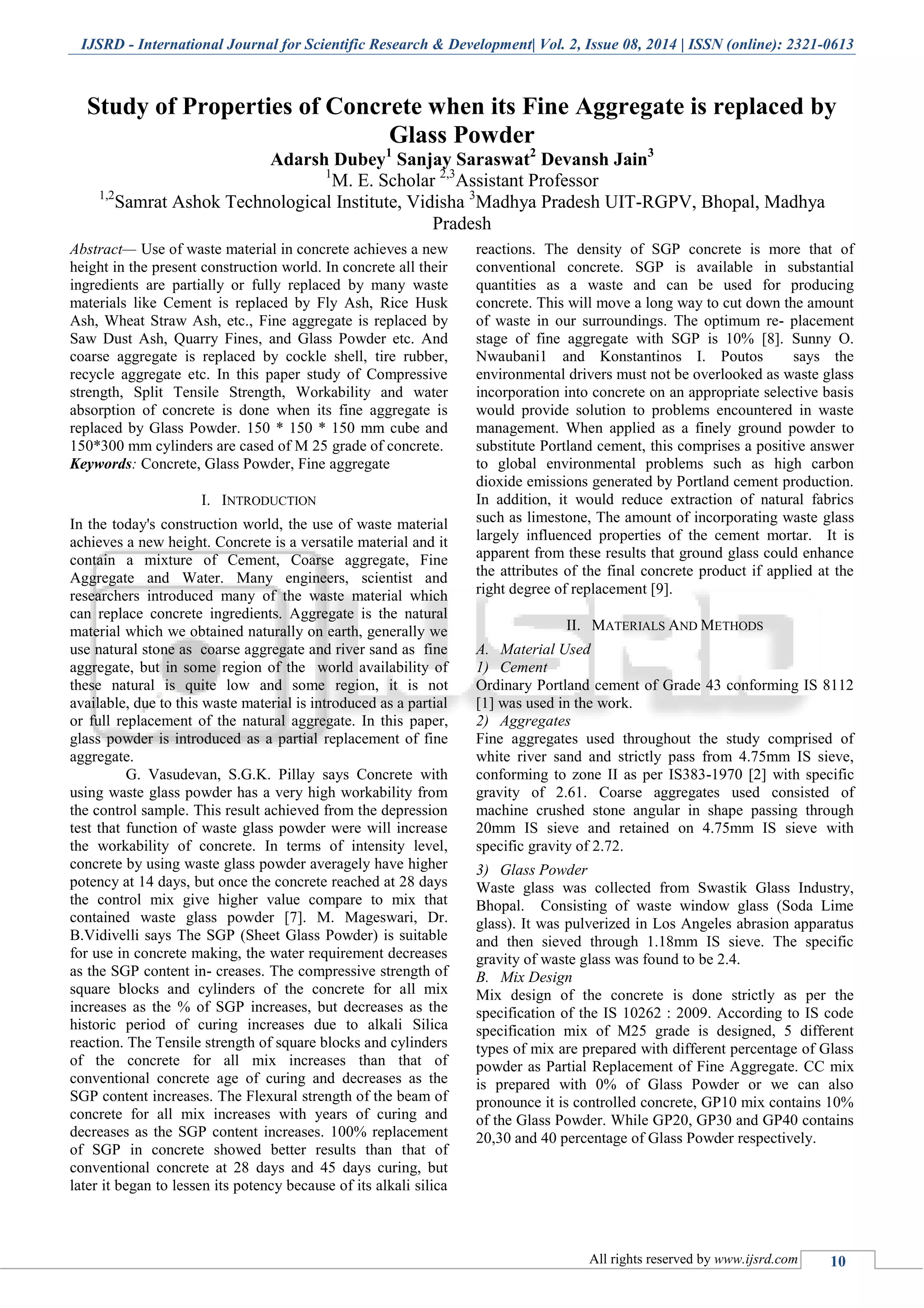 This document investigates the effects of replacing fine aggregate in concrete with glass powder. It demonstrates that up to 30% replacement can enhance compressive strength while improving workability and reducing water absorption, but reveals a decrease in tensile strength with increased glass content. The study highlights the potential for glass powder to provide an environmentally friendly solution to waste management and support sustainable construction practices.