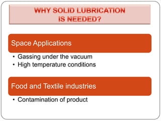 1. Dry sliding tests showed high friction over 0.5 without lubrication. MoS2 coatings reduced friction to around 0.1-0.15.