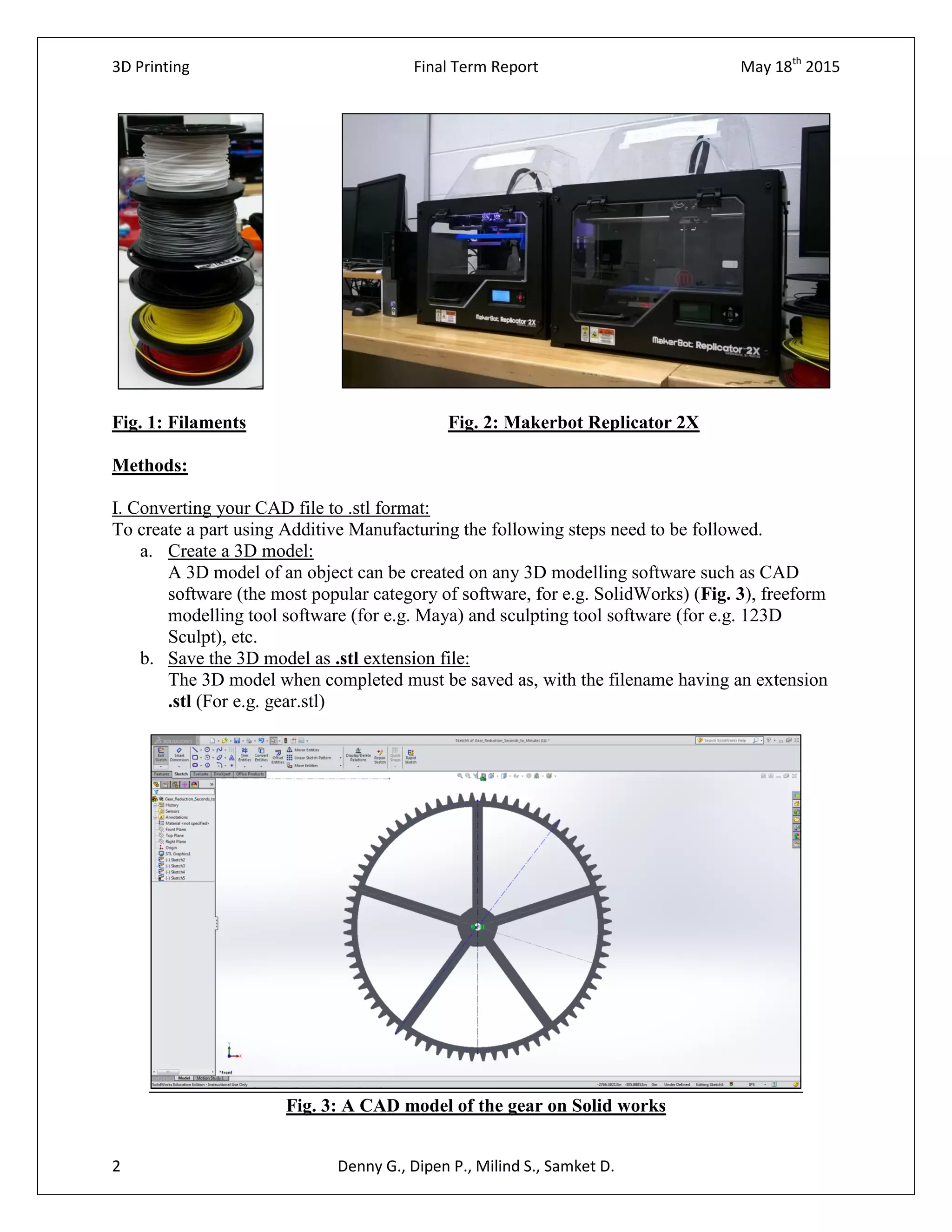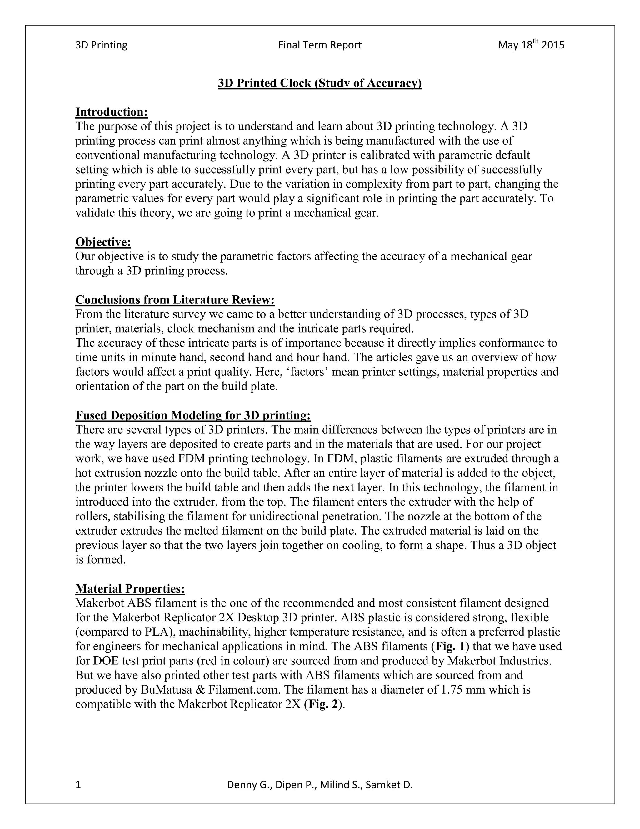 The document summarizes a study on the accuracy of 3D printed gears. It details the objectives to study how printing parameters like layer thickness, infill density, and shells affect accuracy. 24 test gears were printed with different combinations of these parameters. Their dimensions were measured using calipers and an optical comparator. Root mean square analysis of the error values found that a gear printed with 0.3mm layer thickness, 10% infill density, and 3 shells had the least error, indicating the most accurate print. The results provide guidance on parameters for accurately printing similar gear components.