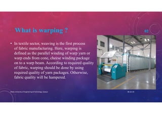 The document presents a comprehensive study on direct warping in textile engineering, detailing its definition, types, requirements, and the working principles of a high-speed warping machine. It covers the advantages and disadvantages of direct warping, along with typical calculations, components, and methods to improve the warping process. Furthermore, it discusses common faults in warping and their remedies.