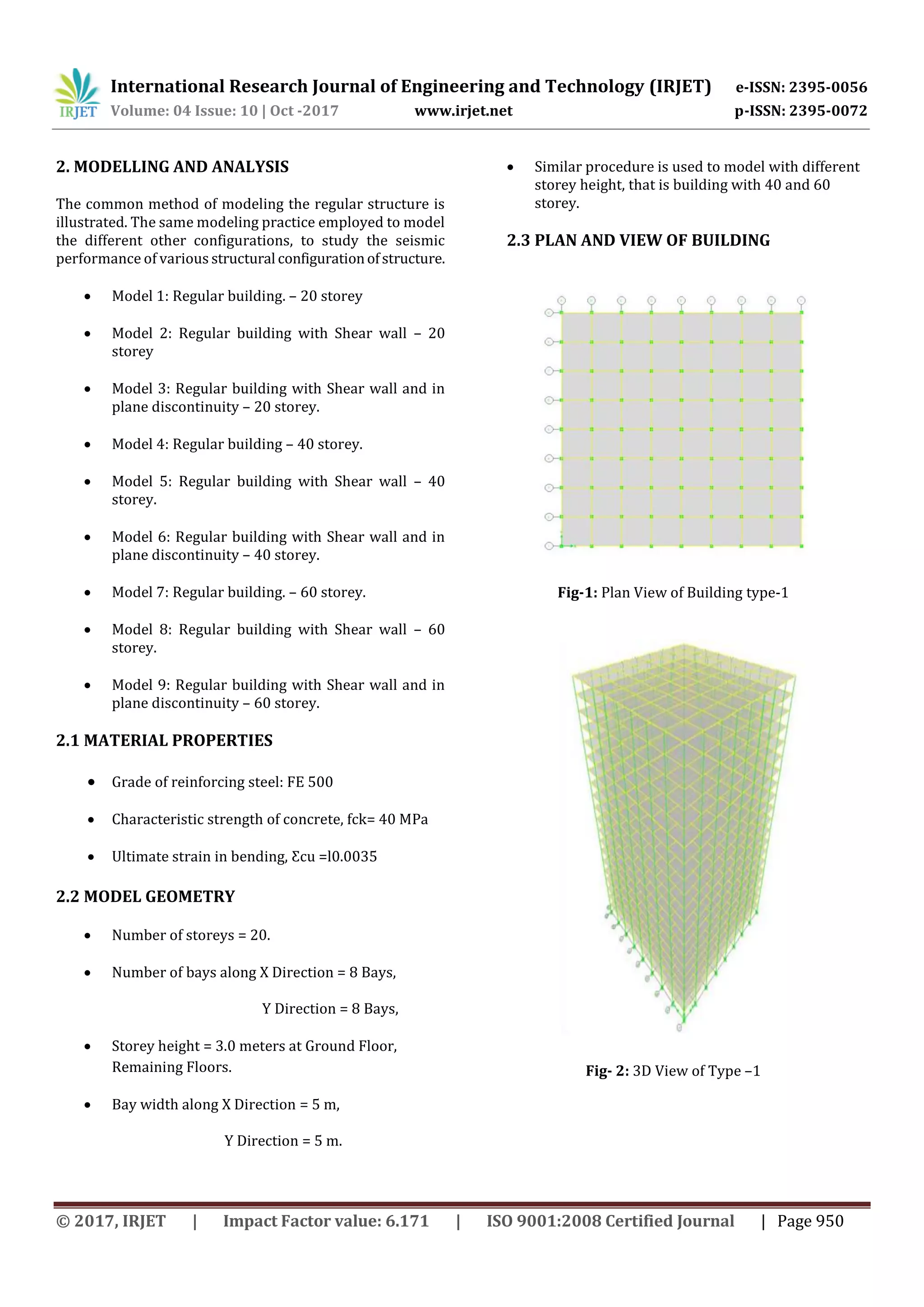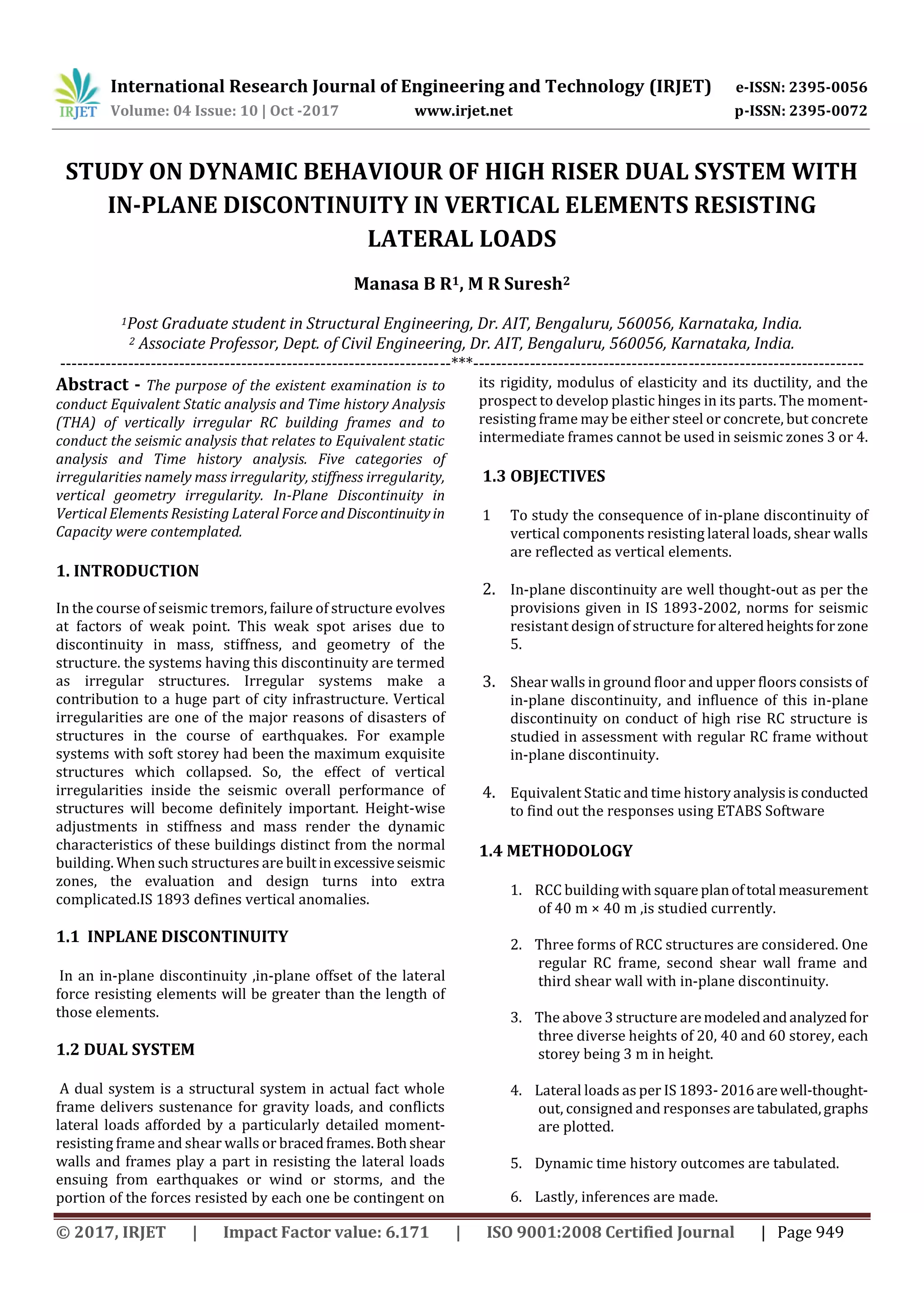 This study analyzes the dynamic behavior of high-rise dual systems with in-plane discontinuities in vertical elements resisting lateral loads. Three types of reinforced concrete structures are modeled - a regular frame, a frame with shear walls, and a frame with discontinuous shear walls. The structures are analyzed for heights of 20, 40, and 60 stories using equivalent static analysis and time history analysis in ETABS. Results show that shear walls reduce time period but increase stiffness. Taller structures have increased displacements, drifts, and base forces. Structures with discontinuous shear walls have smaller responses than regular frames, but perform worse than continuous shear wall structures above 40 stories.