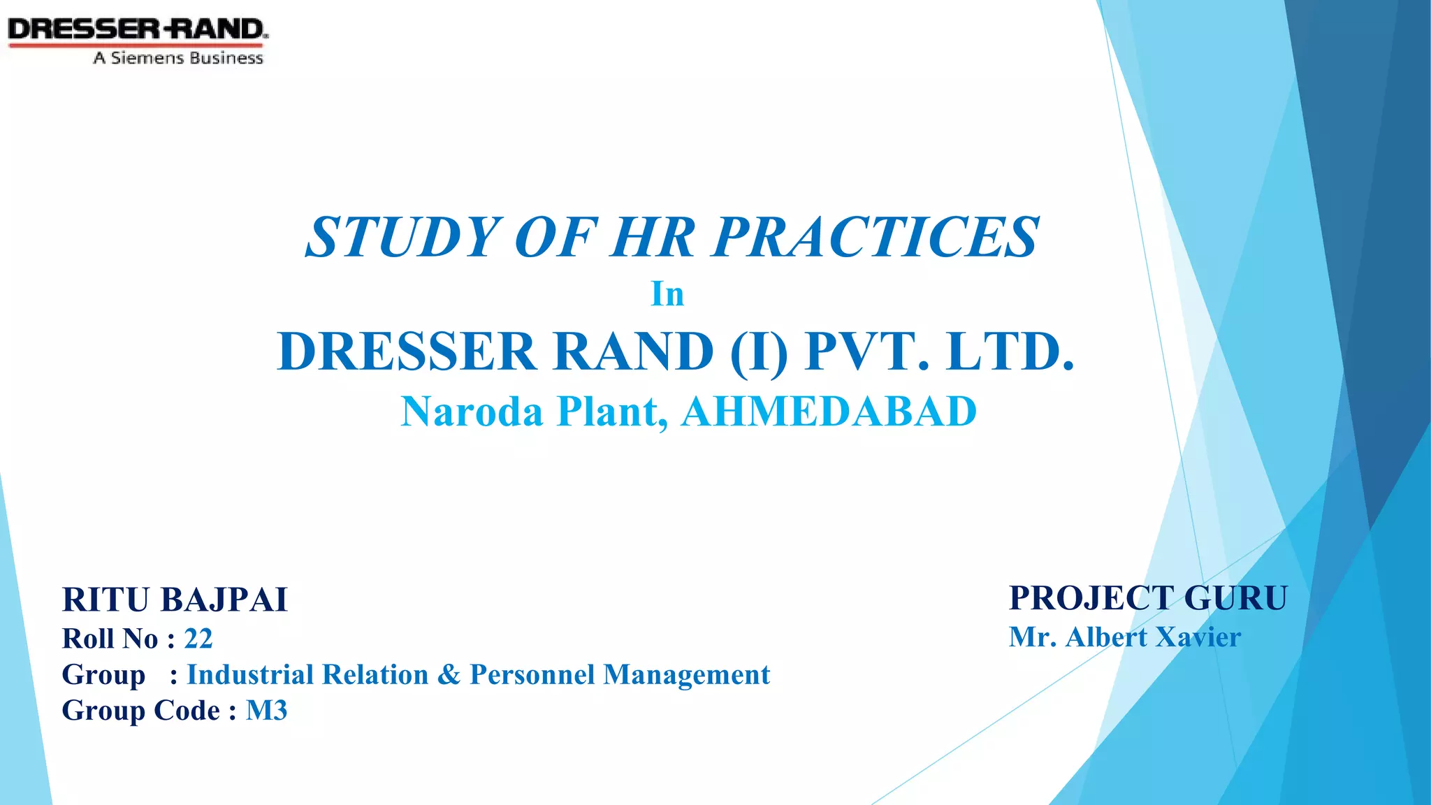 The document details a study on HR practices at Dresser-Rand India Pvt. Ltd. in Ahmedabad, focusing on the company's operations, HR methodologies, and employee satisfaction levels. Key findings highlight effective HR practices such as daily communication and training sessions, while recommendations suggest enhancing interdepartmental collaboration and diversifying the workforce. Limitations include time constraints and potential biased responses, emphasizing the report's relevance for management students and company management alike.