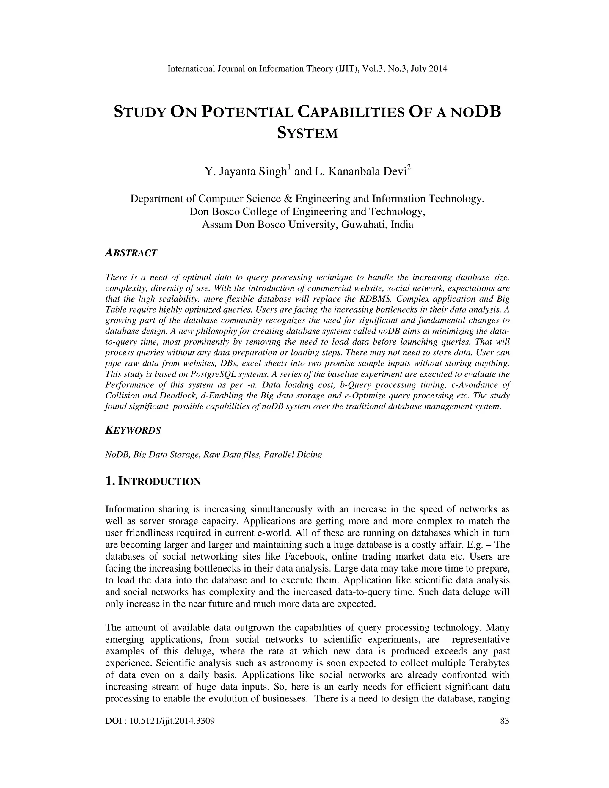 This document explores the concept of a NoDB system aimed at minimizing data-to-query time by eliminating data loading requirements in database management. The study, based on PostgreSQL, presents an evaluation of the NoDB system's performance across various metrics, demonstrating its advantages over traditional relational database management systems in handling big data. Key innovations include adaptive indexing, zero initialization overhead, and the ability to process queries directly on raw data files without prior loading.
