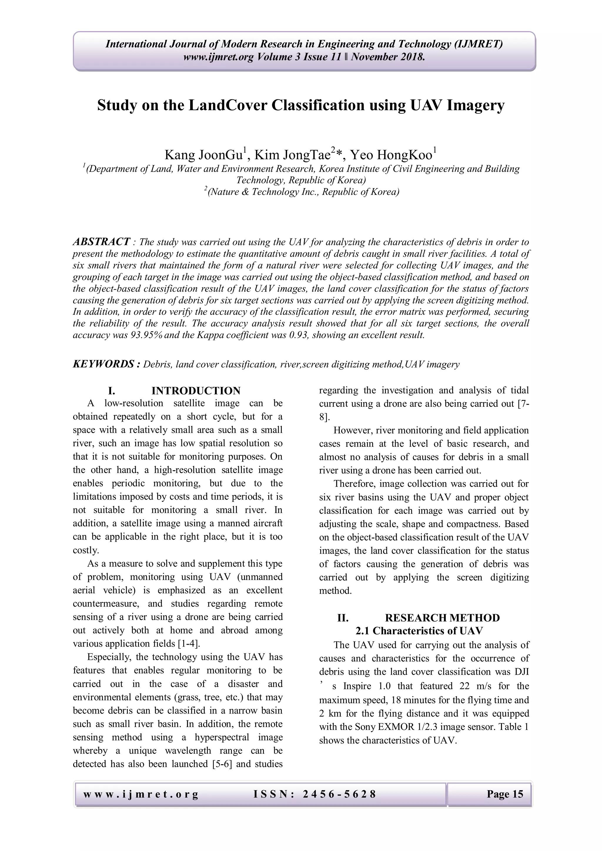 The study examines land cover classification using UAV imagery to analyze debris characteristics in small river facilities, achieving an overall accuracy of 93.95% and a kappa coefficient of 0.93. Six natural rivers were selected for UAV image collection, and object-based classification methods were applied to assess factors contributing to debris generation. The findings indicate a high effectiveness of UAV technology in monitoring and classifying land cover in small river basins.
