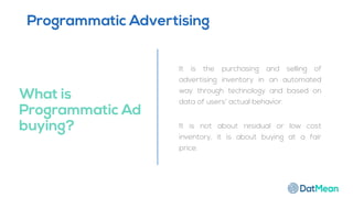 The document discusses programmatic advertising, highlighting its automation, flexibility, and efficiency in purchasing ad inventory based on user data. It emphasizes the importance of data quality and the evolving ecosystem, including the roles of advertisers, agencies, and data suppliers in optimizing campaigns. Additionally, it explores the significant growth of programmatic advertising in regions like Europe and Latin America, predicting continued expansion and the integration of programmatic with various media formats.