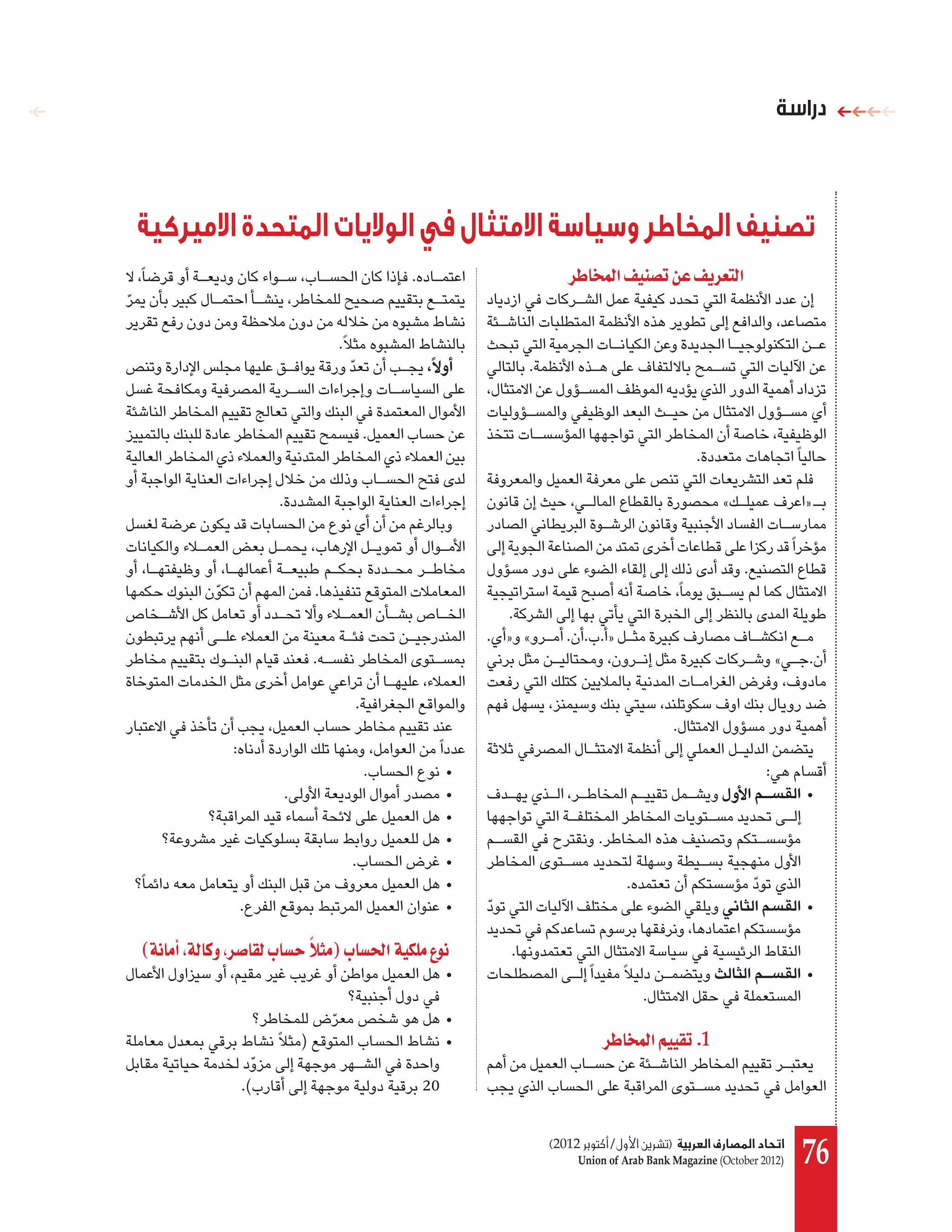 اﻻﻣﺘﺜﺎل ﻓﻲ اﻟﻮﻻﻳﺎت اﻟﻤﺘﺤﺪة اﻻﻣﻴﺮﻛﻴﺔ . ôWÉîªdG ∞«æ°üJ øY ∞jô©àdG . . . . . « » . . . . » « . . .» . « . . . : . • : . • • • • . . • • . . • • (áfÉeCG ,ádÉch ,ô°UÉ≤d ÜɰùM Óãe) ÜɰùëdG á«μ∏e ´ƒf k . • • . • ) • ôWÉîªdG º««≤J .1 .( 20 (2012 اﲢﺎد اﳌﺼﺎرف اﻟﻌﺮﺑﻴﺔ )ﺗﺸﺮﻳﻦ ا ول/ أﻛﺘﻮﺑﺮ Union of Arab Bank Magazine (October 2012) 76