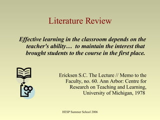 The document discusses a study on student satisfaction at universities. It examines different factors that can motivate students, including holding high expectations, helping students set goals, and being enthusiastic about the subject. It also describes an experiment using a basic human capital model to analyze students' choices between effective and ineffective learning based on expected future wages. A questionnaire was administered asking students about incentives, and the results showed high alignment with teaching incentives but lower alignment for monetary and research incentives.