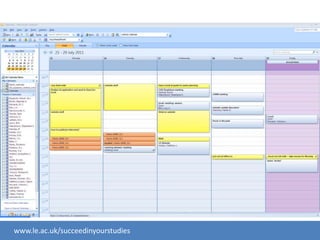 This document discusses developing effective study skills. It identifies common obstacles to effective study such as lack of planning, motivation, and suitable study space. It then provides strategies to overcome these obstacles, including setting priorities, breaking large tasks into smaller steps, creating a schedule, and reviewing progress. The document encourages peer-assisted learning and sharing expertise to improve study skills and recommends resources for developing time management techniques.