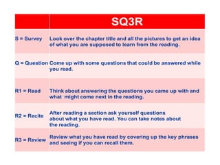 This document provides study skills and tips for being a successful student. It discusses how to effectively structure study sessions by organizing subject matter, getting daily work done, and revising for exams. Some key tips include taking good notes in class, keeping an organized notebook, planning dedicated study times, not cramming before tests, asking questions, and discussing topics with peers. The document also notes that people retain the most information through sight and by saying and doing things themselves. Overall, it emphasizes the importance of actively engaging with material by reciting, writing, visualizing, quizzing oneself, and practicing skills learned.