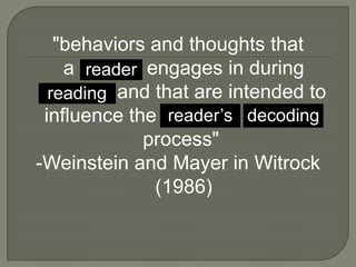 The document provides information on various reading strategies and study skills. It discusses strategies such as SQ3R (Survey, Question, Read, Recite, Review), KWL (Know, Want to Know, Learned), and strategies for increasing reading speed such as reading groups of words instead of fixing on individual words. It also lists tips for effective reading such as having a motivation for reading, reducing distractions, and taking breaks. Finally, it provides citations for sources on additional reading and study strategies.