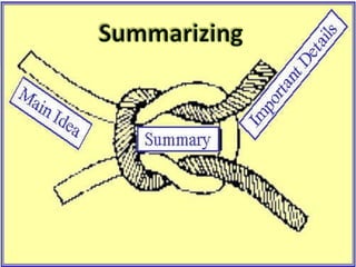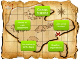 The document discusses effective study strategies such as note taking, concept mapping, outlining, and summarizing. It recommends using headings and bullet points when taking notes to organize information. Concept mapping creates links between new information and past knowledge, which encourages comprehension. The document suggests creating a study guide using these techniques to help with learning course material.
