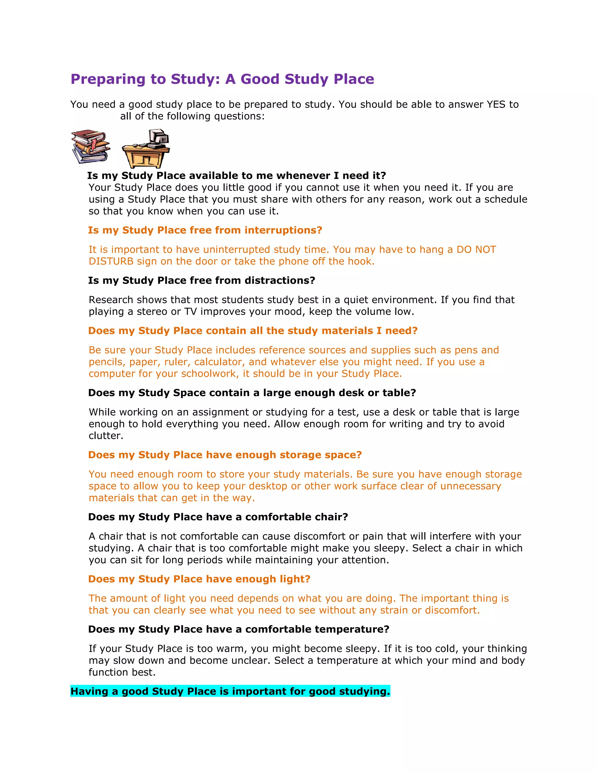 The document provides tips for effectively managing study time. It recommends creating a term calendar at the beginning of each term to schedule all assignments, tests, and activities. It also advises preparing a weekly schedule each Sunday to plan the upcoming week's classes, assignments from the term calendar, notes review, and activities. Finally, it suggests using a daily organizer to plan each day, transferring unfinished tasks and adding notes review and activities. Proper time management through advance planning is important for academic success.