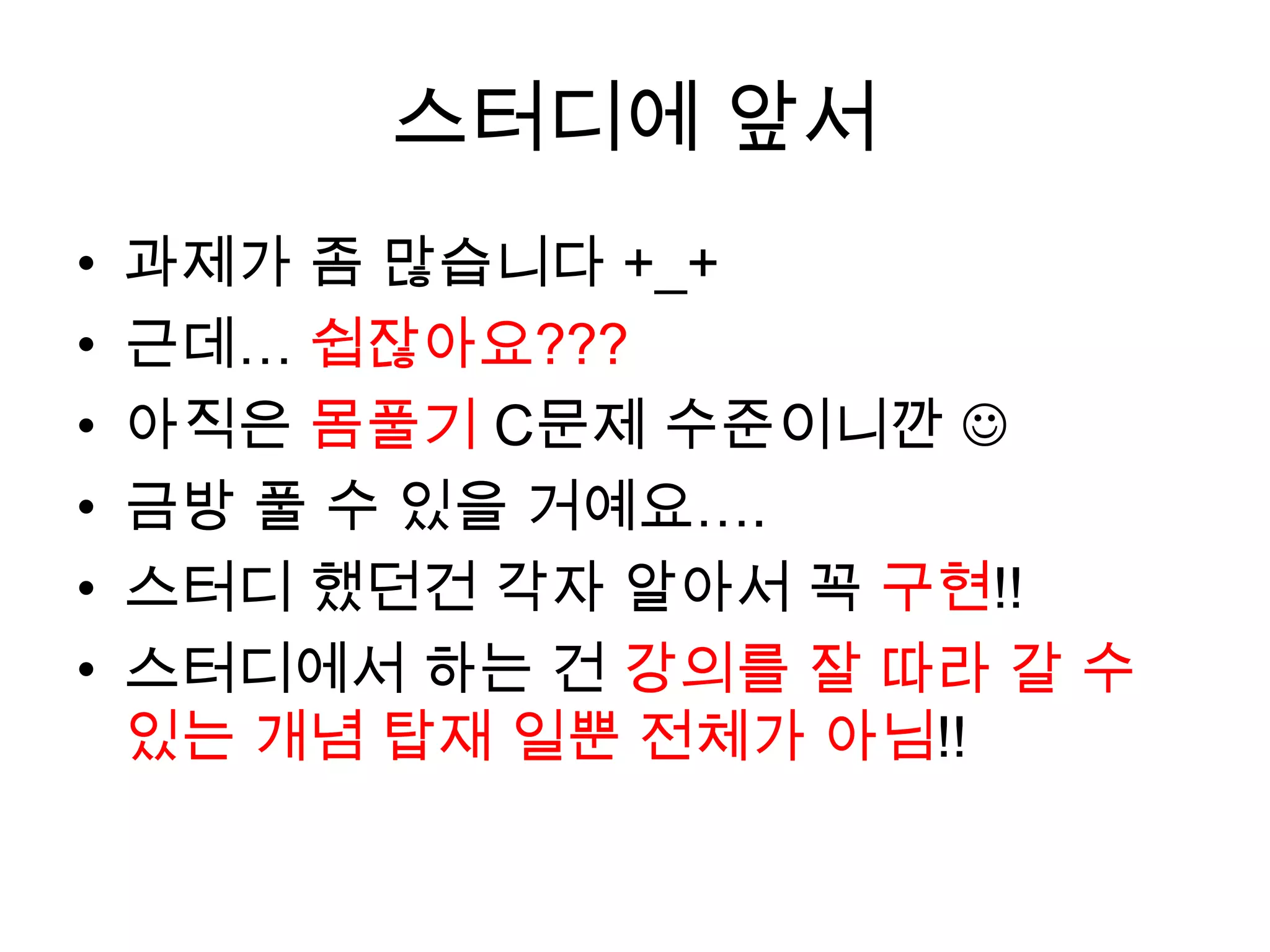 Study2 1. 2. 스터디에 앞서과제가 좀 많습니다 +_+근데…쉽잖아요???아직은 몸풀기C문제 수준이니깐 금방 풀 수 있을 거예요….스터디했던건 각자 알아서 꼭 구현!!스터디에서 하는 건 강의를 잘 따라 갈 수 있는 개념 탑재 일뿐 전체가 아님!! 3. 4. Stack 과 Queue 공통사항그냥 “개념”일 뿐이다따라서 구현은 알아서 하면 된다.보통 Linked List, 배열로 구현스터디에선 배열로만 구현 Overflow와 Underflow가 존재한다.Overflow : 넣을 공간이 없는데 넣을 시Underflow : 뺄 자료가 없는데 뺄 시 5. 6. 일반적인 Stack의 함수Push() // Stack에 Data를 넣음Pop() // Stack에서 Data를 빼냄Empty() // Stack이 비었나 확인Full() // Stack이 꽉 찼나 확나 7. 함수 구현은 이렇게…int stack[MAX], top=0;int Empty(){return top==0;}int Full(){return MAX==top;}void Push(int item){if(!Full()) stack[top++]=item;}int Pop(){if(!Empty()) return stack[--top];} 8. Quiz…Data 1 2 3 4 가 주어지고 Stack이 주어질때 다음은 어떤 연산을 거쳐야 나오나요?1 2 3 4PushPopPushPop PushPop PushPop1 3 2 41 4 3 24 3 2 14 1 2 3 9. 10. 일반적인 Queue의 함수Push() // Queue에 Data를 넣음Pop() // Queue에서 Data를 빼냄Empty() // Queue이 비었나 확인Full() // Queue이 꽉 찼나 확나 11. 함수 구현은 이렇게…int queue[MAX], front=0, rear=0;int Empty(){return front==rear;}int Full(){return MAX==rear;}void Push(int item){if(!Full()) queue[rear++]=item;}int Pop(){if(!Empty()) return queue[front++];}
