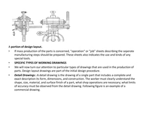 This document discusses different types of drawings used for manufacturing, including:
