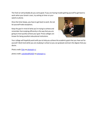 This document provides studying tips for students attending Provo colleges, emphasizing the importance of organization and prioritization at the start of a new semester. Key strategies include studying before bed and after waking up to enhance memory retention, breaking information into manageable chunks, and taking regular breaks to maintain concentration. The overall message encourages students to work diligently towards their academic goals to achieve desired degrees.
