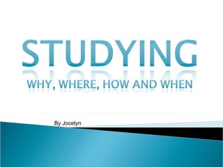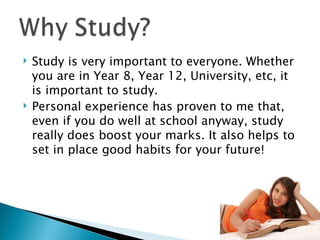 Studying is important for students of all levels from Year 8 to university. While some students do well without studying, studying can boost marks even for those students. Developing good study habits early will help set students up for future success. The document recommends keeping study books organized by subject as a way to take notes and separate key concepts, facts, and equations from other class materials. It suggests studying in a quiet place without distractions, sitting properly at a desk or table. Consistent daily study times are also advised rather than cramming late at night.