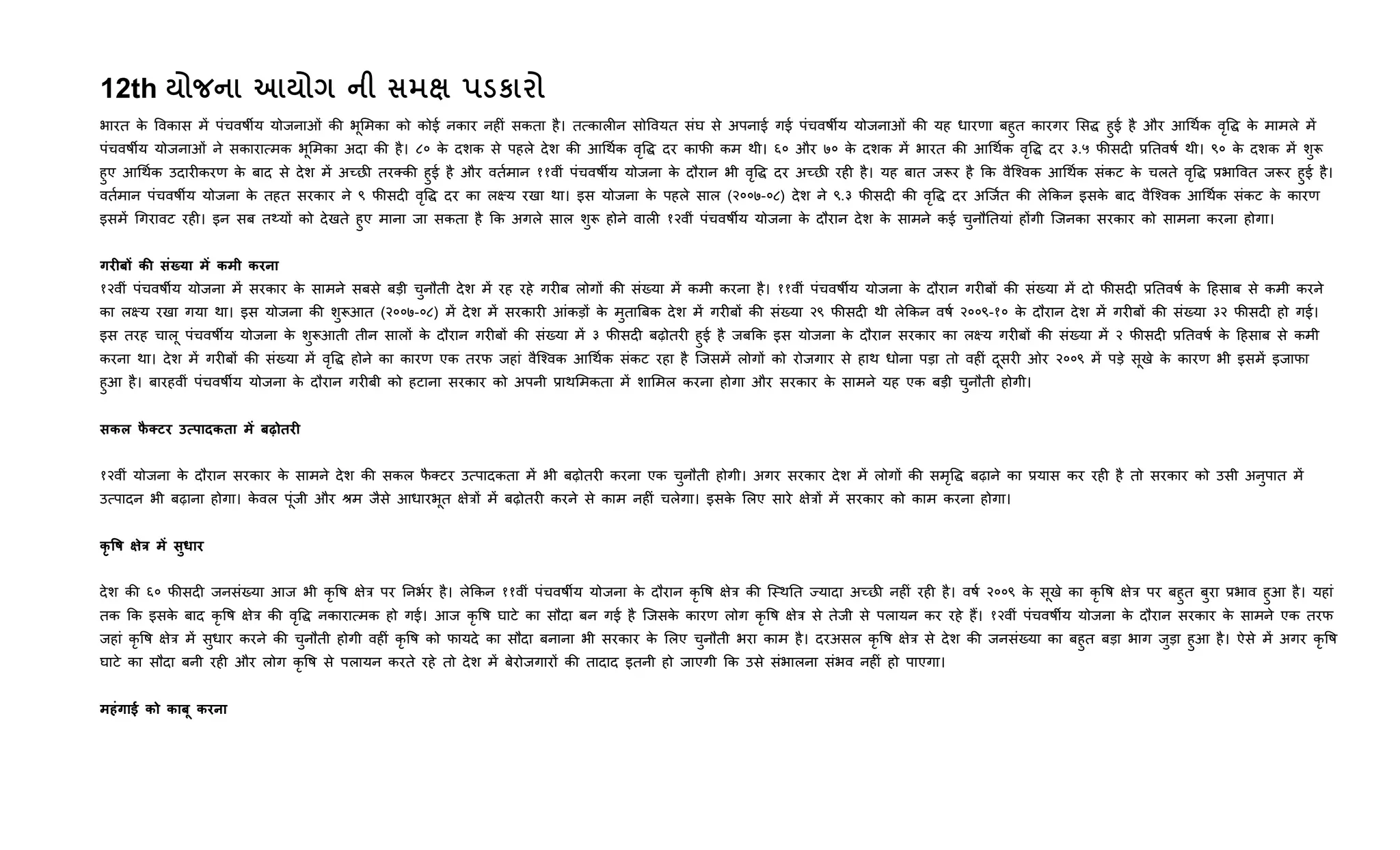 इसम +गरावट रह । इन सब तQयR को देखते हुए माना जा सकता है Fक अगले साल शु= होने वाल १२वीं पंचवष य योजना के दौरान देश के सामने कई चुनौ;तयां हRगी िजनका सरकार को सामना करना होगा।