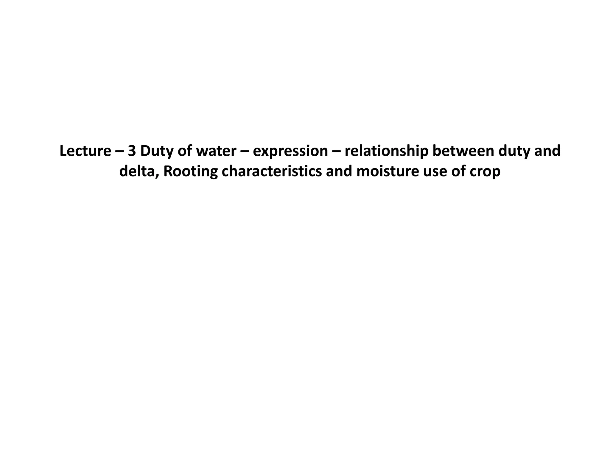 Duty of water refers to the relationship between the amount of irrigation water and the area of crop that can be fully matured with that water. It is expressed as the area irrigated per unit rate of flow, depth of water, or stored water volume. The duty is affected by soil characteristics, climate, rainfall, crop type, topography, irrigation method, and other factors. Improving duty involves proper plowing, suitable irrigation methods, canal lining, minimizing idle canal length, good water quality, crop rotation, and volumetric water assessment. Duty delta represents the total water depth required over the base period and is calculated by dividing the duty by the number of days in the base period. Sample problems are provided to calculate