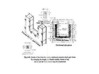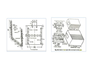 2) Check gates are placed in channels to form adjustable dams and raise the water level for irrigation. They consist of walls with a gate and come in various materials like concrete, wood, or metal.