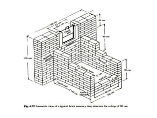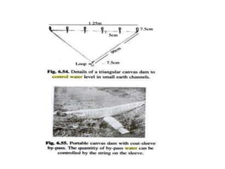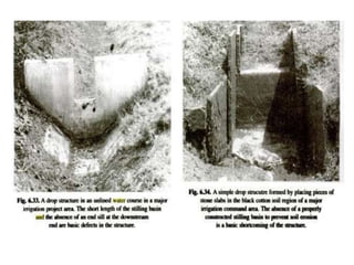 1) Various structures are used to control water flow in irrigation channels to prevent erosion and allow for diversion of water. These include drop structures, chute spillways, check gates, portable check dams, diversions, turnouts, siphons, flumes, culverts, and inverted siphons.