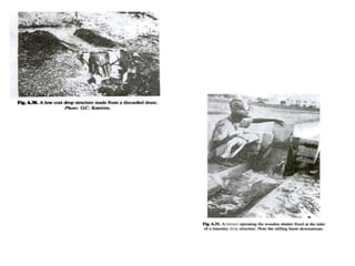 3) Siphons, flumes, culverts, and inverted siphons are used to carry irrigation channels across obstructions like roads, streams, or depressions. They use pipes or channels supported