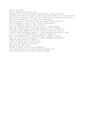 Anabel Barragan imagines graduating high school in 2015 with good grades, passing all her classes, and earning her diploma. She aims to get a scholarship to attend college and study to become a doctor, passing her courses with high grades and earning a degree. After college, she wants to join the Marines as a doctor and serve her country when deployed. While in the Marines, she wants to buy a house wherever she is stationed and stay in touch with her family in Texas. She envisions owning a small, one-story house with a pool and garden in the backyard but no front grass, and driving an eco-friendly car with good gas mileage.
