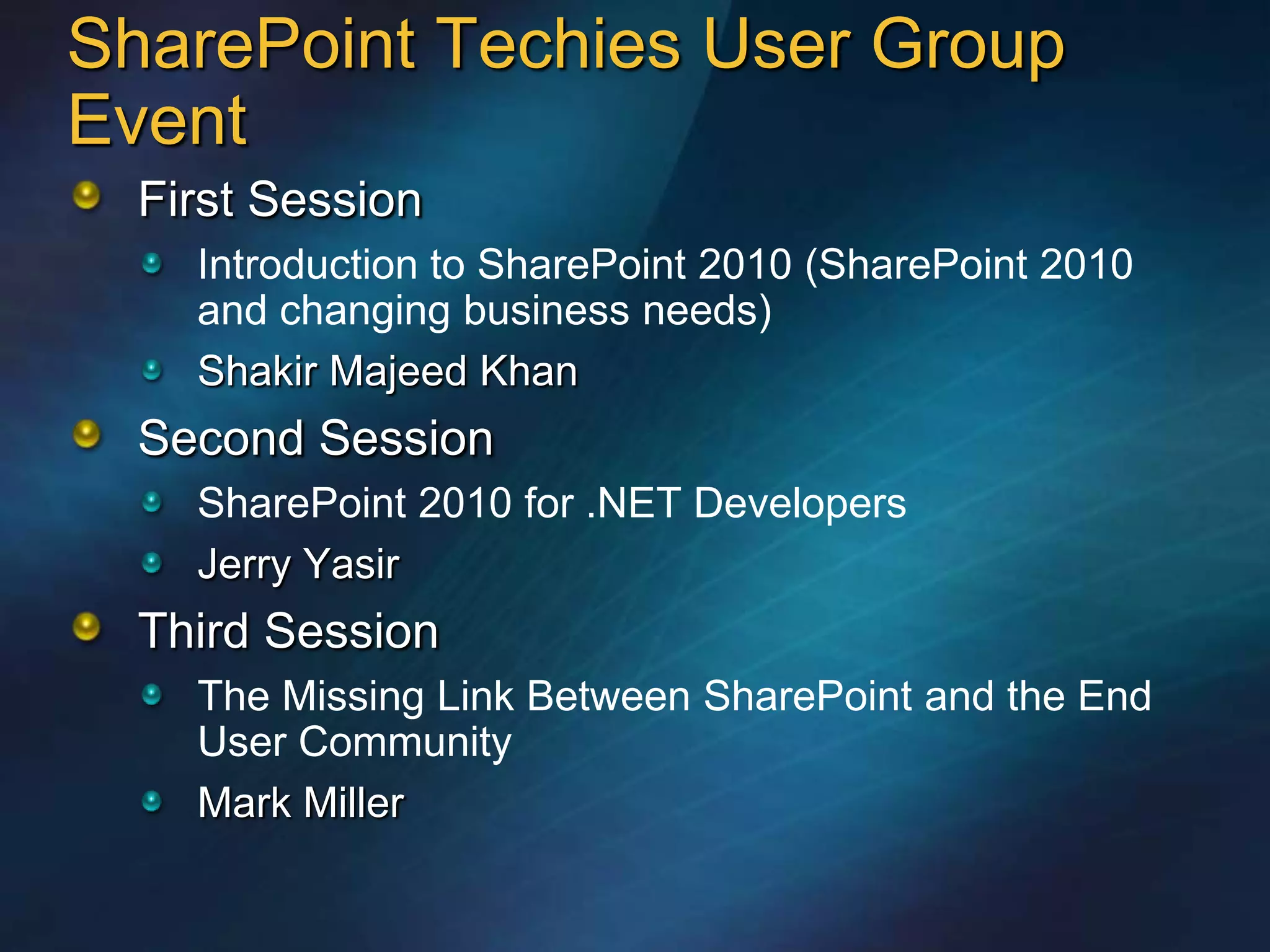 The document summarizes a SharePoint Techies User Group event. It includes three sessions: an introduction to SharePoint 2010, SharePoint 2010 for .NET developers, and the relationship between SharePoint and end users. It also provides details about the speaker Shakir Majeed Khan and an overview of SharePoint 2010 features and architecture.