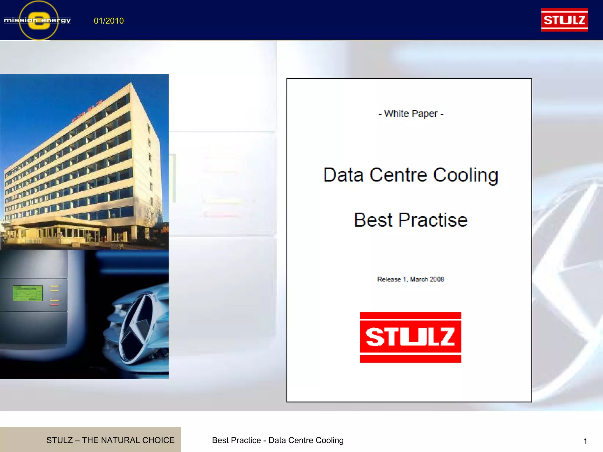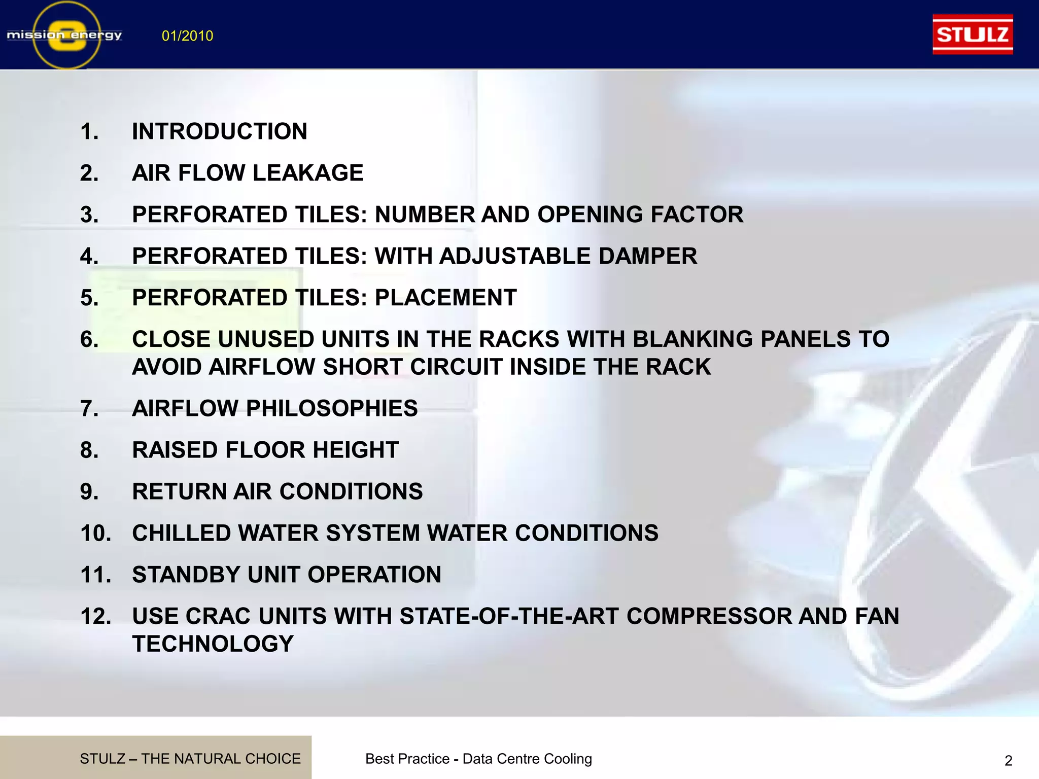This document outlines best practices for data center cooling, including minimizing air leakage, proper placement and number of perforated tiles, separating hot and cold aisles, using blanking panels, and employing state-of-the-art CRAC units. It discusses airflow philosophies like hot aisle containment and raised floor height. Optimal return air conditions and chilled water temperatures are presented. Standby unit operation and EC fan technology are also covered. An example project at Munich Airport that implemented various best practices reduced CRAC power consumption by 35% while lowering cabinet temperatures.