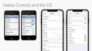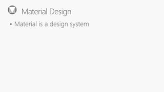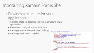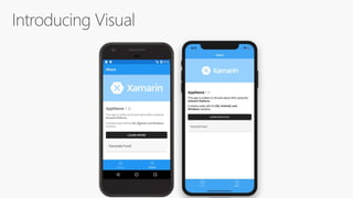 The document discusses Xamarin, an open-source app platform from Microsoft for building applications across multiple operating systems using .NET and C#. It highlights features like shared C# business logic, Xamarin.Essentials for accessing native APIs, and the importance of design systems like Material Design for maintaining consistency and scalability in app development. Additionally, it outlines the Xamarin.Forms framework and provides examples of app structure and navigation within the programming environment.