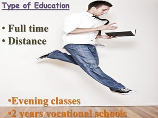 Turkey has over 100 public universities and 70 private universities that provide quality education at an affordable price for international students. Students can gain admission through SAT scores, high school diplomas with grades over 70%, or achievement in international exams. Public university tuition ranges from $200-1600 USD per year while private university costs are $4900-25000 USD annually. The education system uses English, Turkish, French or German for instruction and Turkey offers a culturally diverse experience for international students to study abroad.