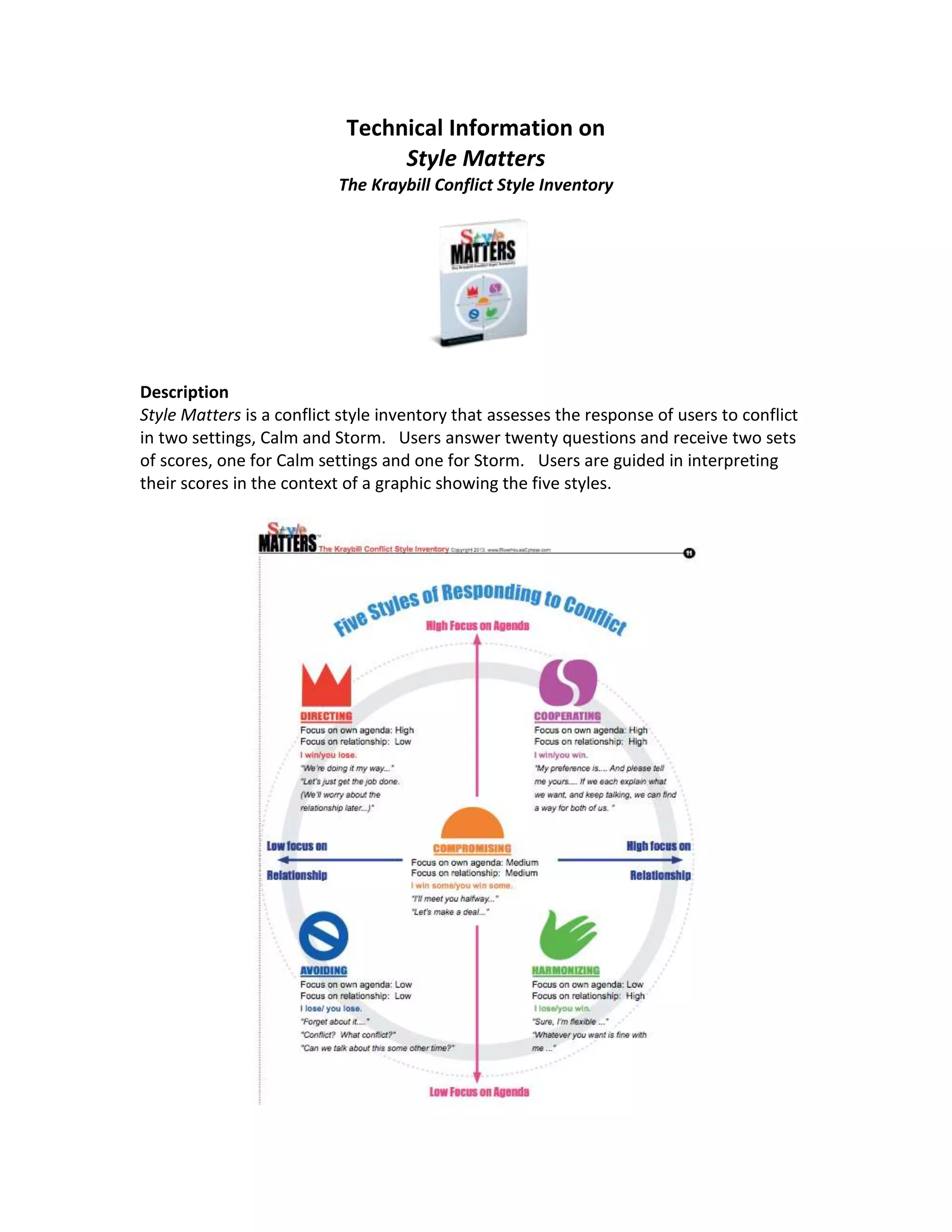 Style Matters is a conflict style inventory that evaluates user responses to conflict in both calm and storm settings through a series of twenty questions, resulting in two sets of scores. It is informed by the Mouton-Blake axis and acknowledges cultural influences on conflict responses, providing options tailored for low and high context cultures. The inventory has undergone reliability and validity testing, demonstrating effectiveness in various research settings, and is available in multiple formats for users and trainers.