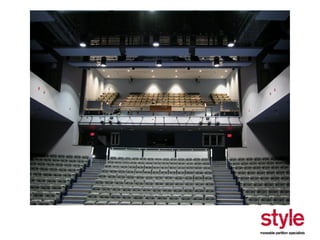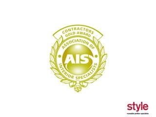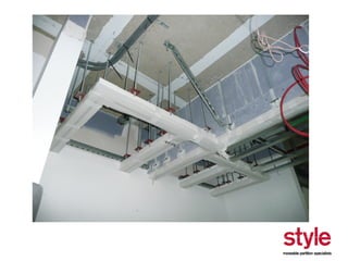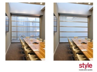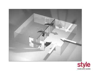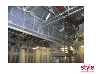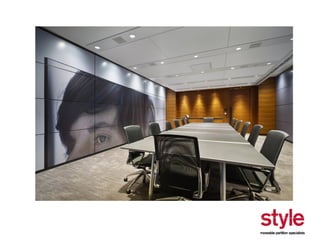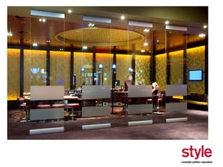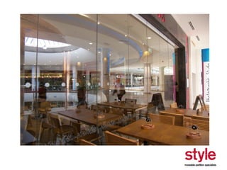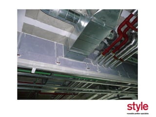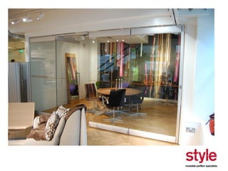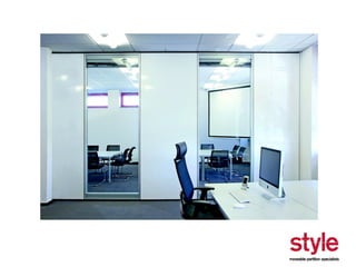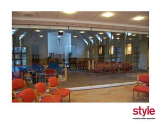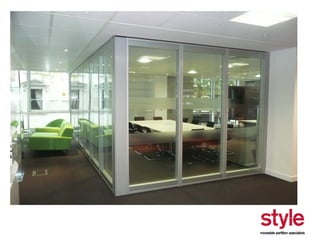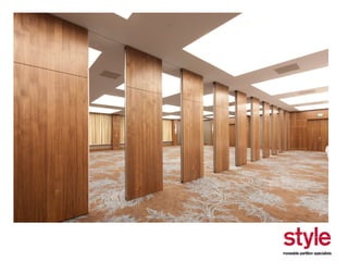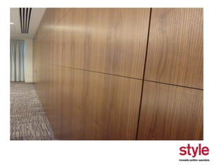 This document provides information about a seminar hosted by Style Partitions on driving innovation through movable wall systems. The seminar agenda covers Style Partitions' plan to achieve competitive advantage through integrated working, sharing innovation and technology, and engaging suppliers. It also discusses acoustic requirements, product features and benefits, and sectors where movable walls are applicable like corporate, education, hospitality, and healthcare. The document includes information about Style Partitions as a company and objectives of the seminar to introduce space division concepts and considerations around acoustic performance, operation, and sustainability.