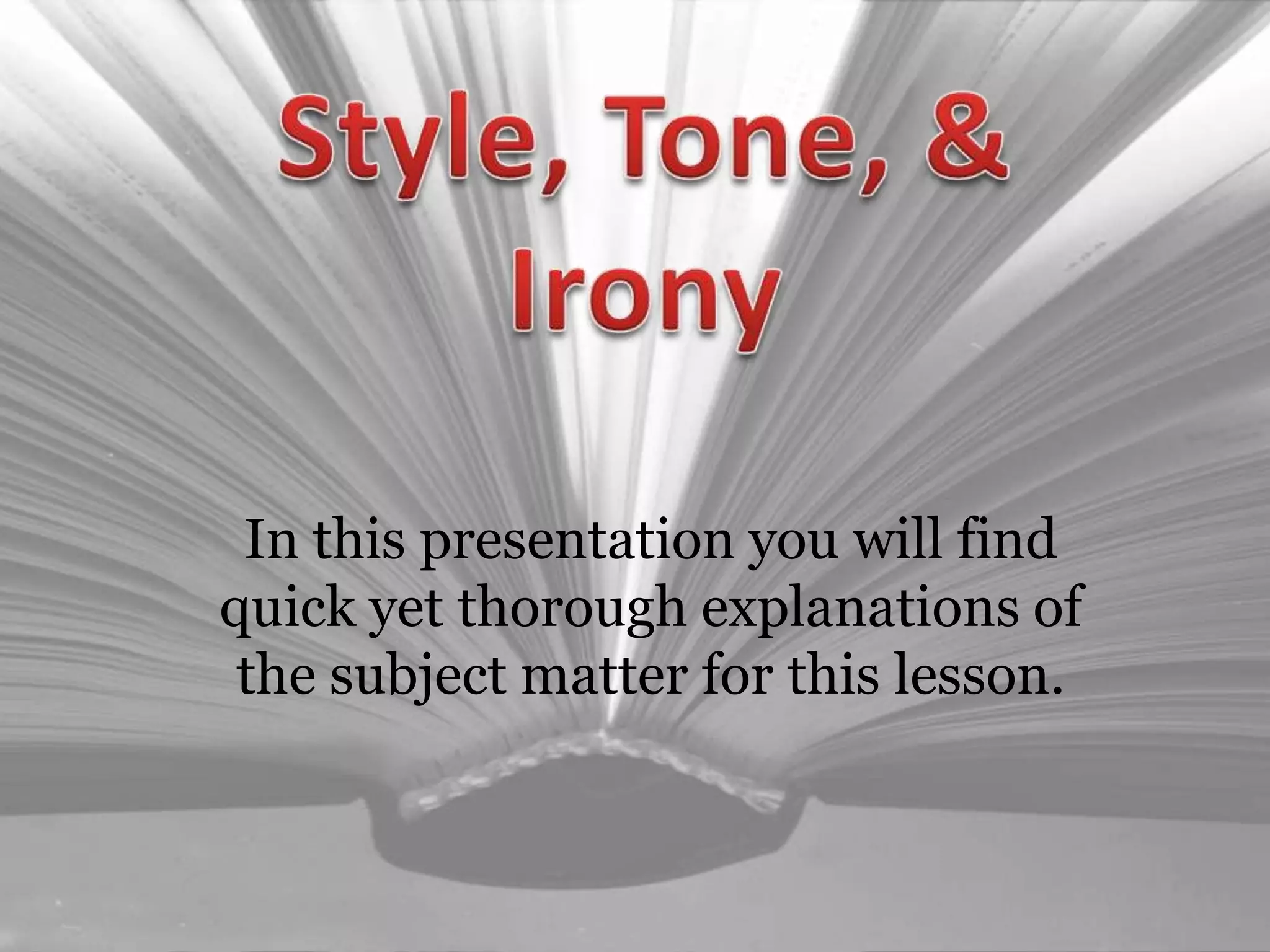 This document provides an overview of style, tone, and irony in writing. It contains: