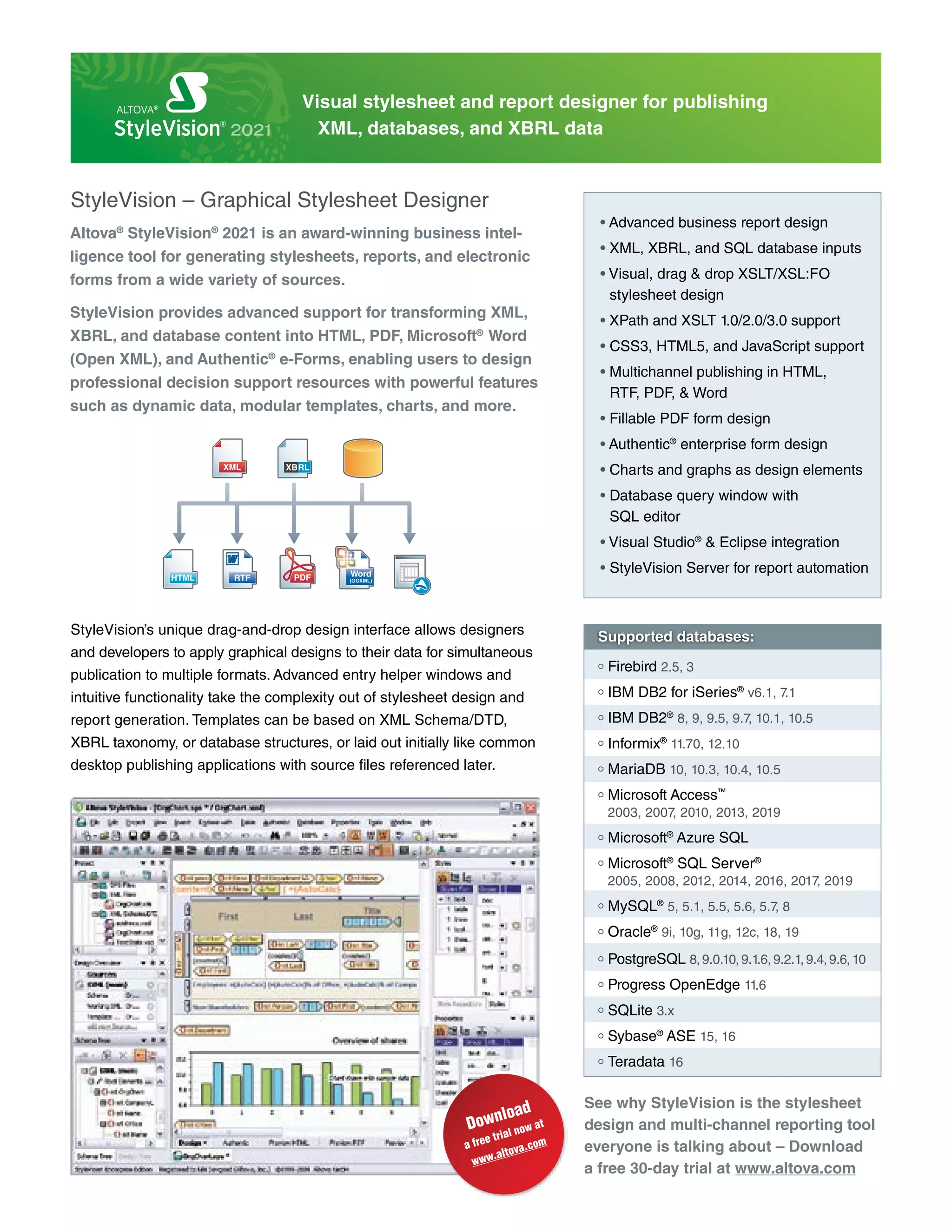StyleVision allows users to design templates that transform XML, XBRL, and database content into multiple formats like HTML, PDF, and Word. Its drag-and-drop interface takes complexity out of stylesheet design. Templates can be based on various data sources and output is generated across multiple channels. StyleVision provides support for visual report design from various data sources with output to HTML, PDF, and other formats.