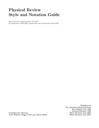 This document provides style and notation guidelines for authors preparing manuscripts for Physical Review journals. It covers correct formatting for manuscript elements such as the title, author list, sections, references, equations, figures and tables. The guidelines are intended to ensure consistency across Physical Review publications. Authors should follow these instructions to properly format their manuscripts, while individual journals may have additional requirements to consider.