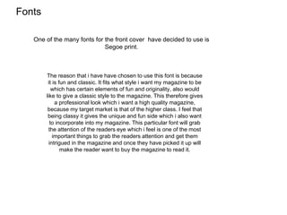 The document discusses font and color scheme choices for different elements of a music magazine, including the cover, contents page, and double-page spread. For the cover, the font Segoe Print was chosen to give a classic, fun style that appeals to the target market of older, higher-class readers. The contents page and double-page spread use consistent fonts and color schemes to provide uniformity throughout the magazine. The color scheme aims to be subtly eye-catching rather than bright like other pop magazines, using lighter pinks and purples to appeal to an older female audience.