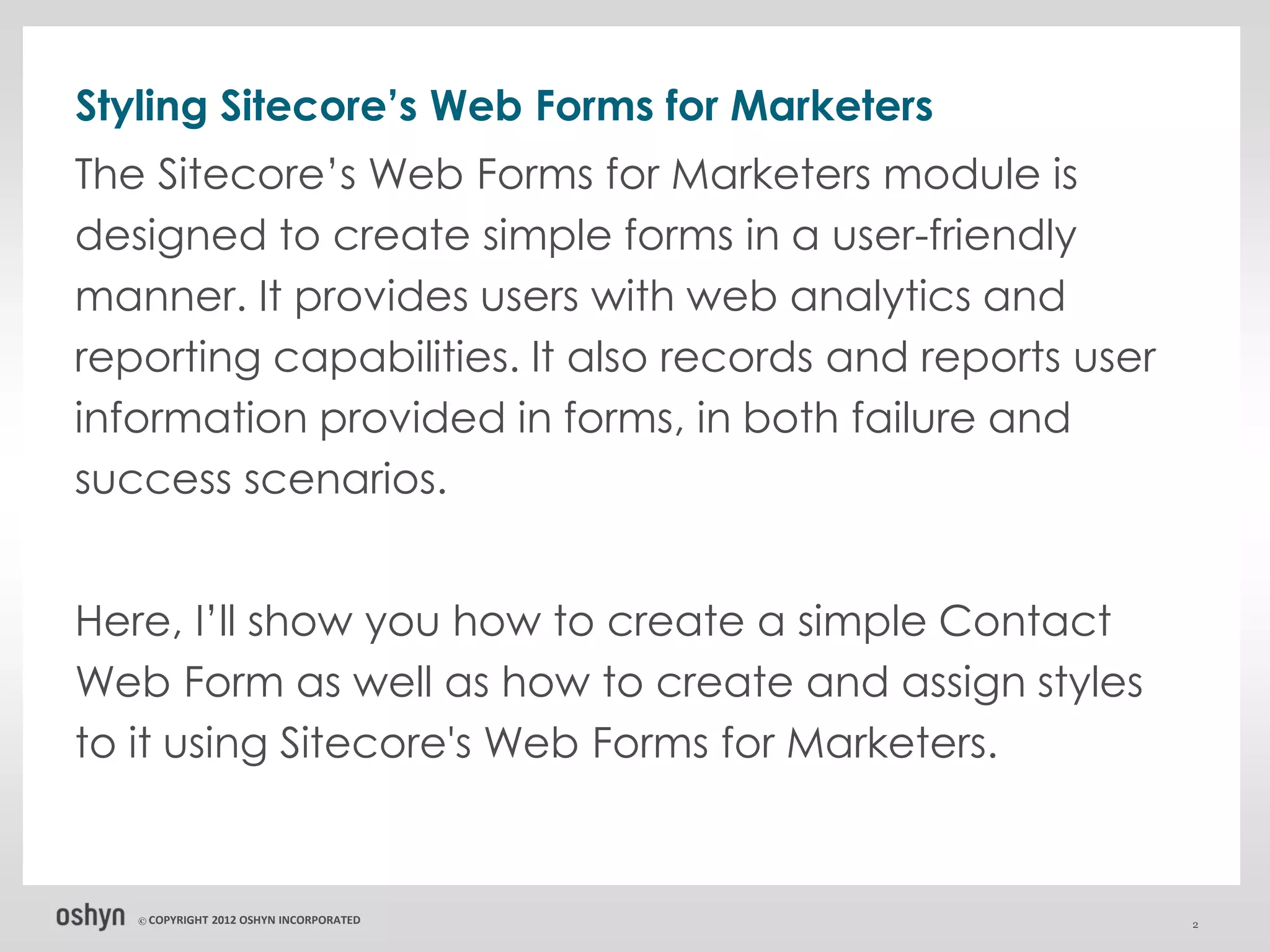 The document provides a step-by-step guide on styling Sitecore's Web Forms for Marketers module, which allows users to create simple forms while offering web analytics and reporting capabilities. It details how to create a contact form, add fields, set up actions for the submit button, and assign CSS styles to fields. Key takeaway points emphasize the ease of use of the module and suggestions for front-end developers on managing the complex markup generated by it.