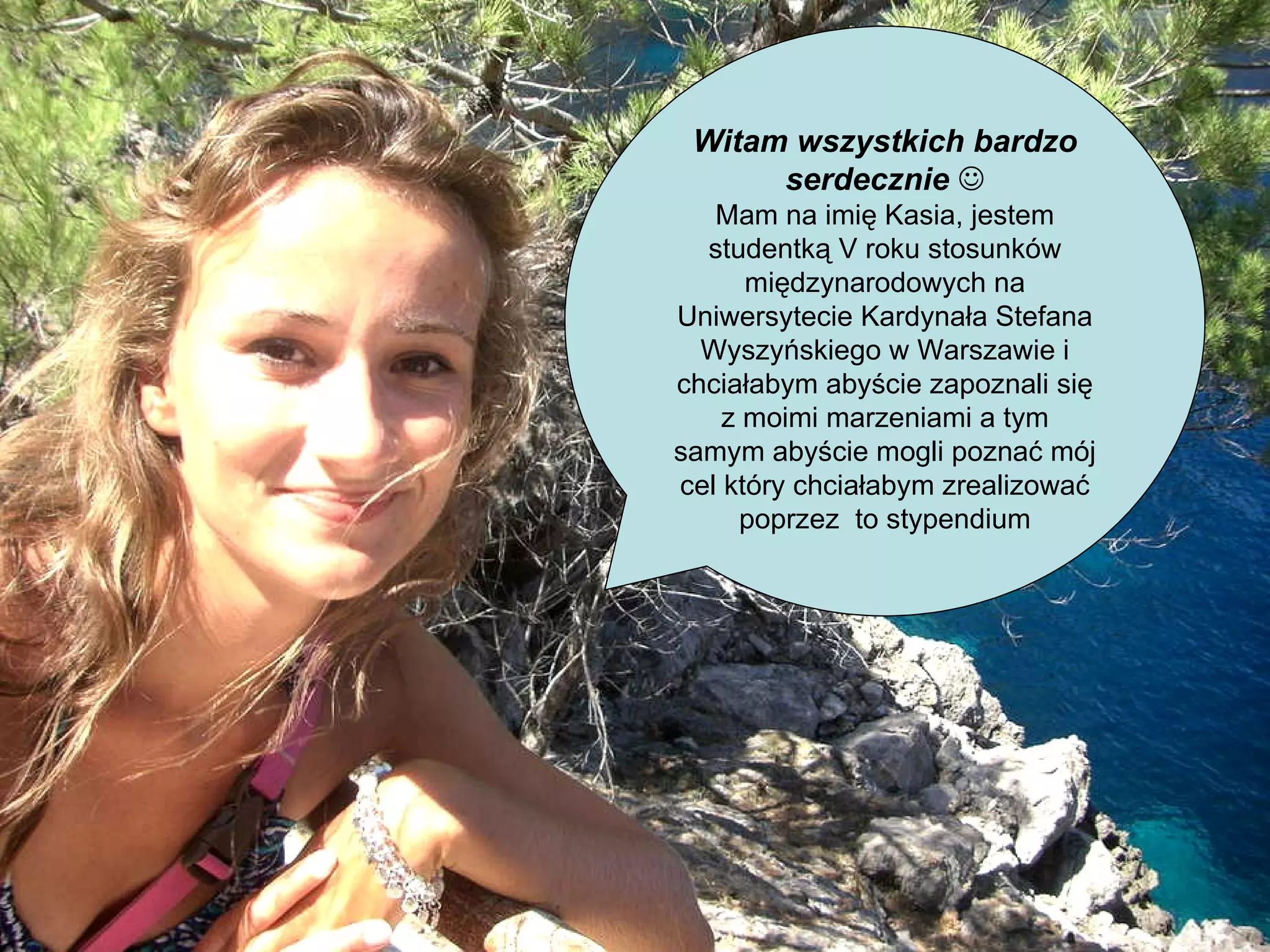 Witam wszystkich bardzoserdecznie Mam na imię Kasia, jestem studentką V roku stosunków międzynarodowych na Uniwersytecie Kardynała Stefana Wyszyńskiego w Warszawie i chciałabym abyście zapoznali się z moimi marzeniami a tym samym abyście mogli poznać mój cel który chciałabym zrealizować poprzez to stypendium