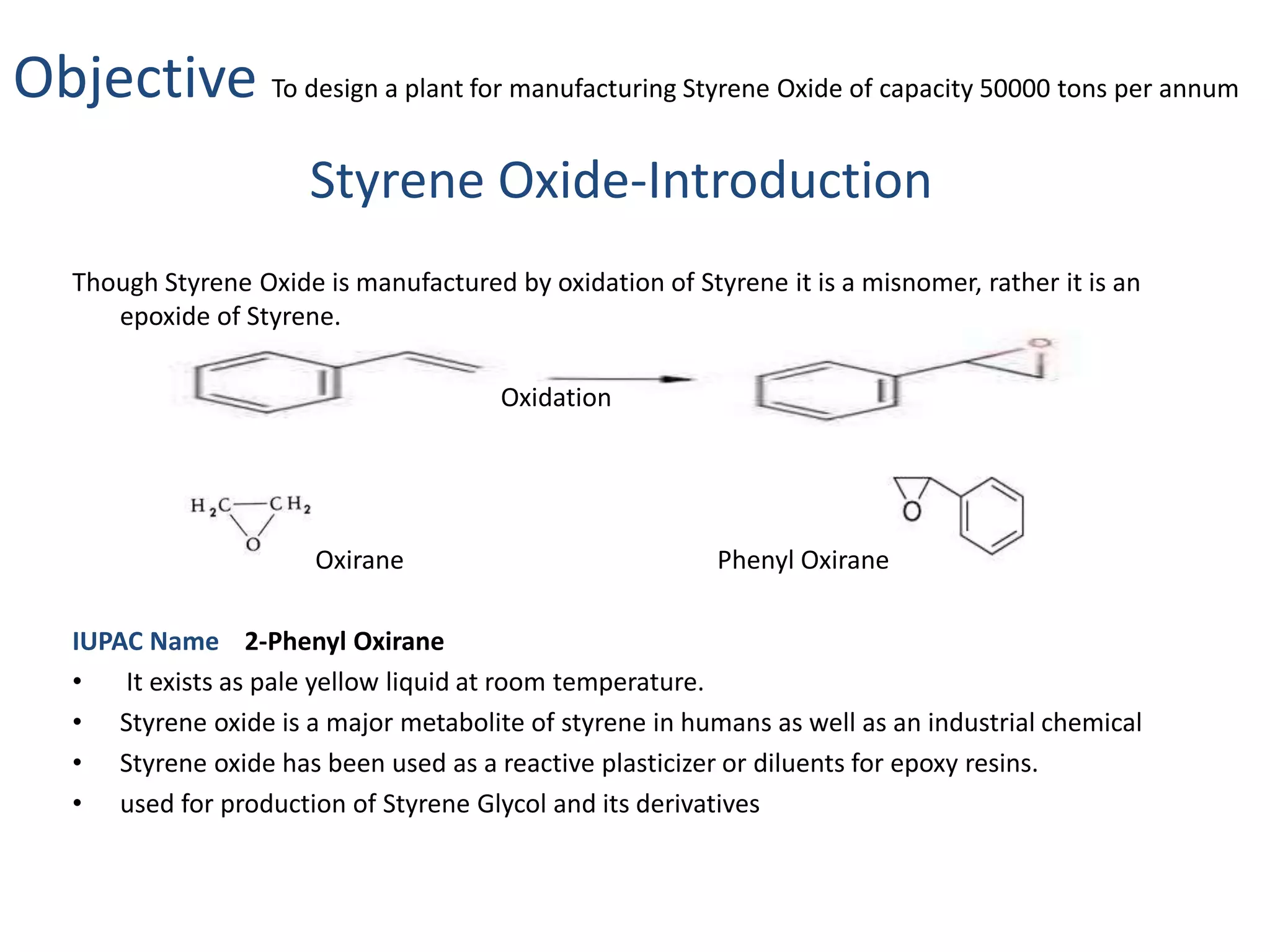 1) Styrene oxide is produced through the oxidation of styrene and will be manufactured using a process involving the production of ethylbenzene, styrene, and then chlorination of styrene to produce styrene oxide.