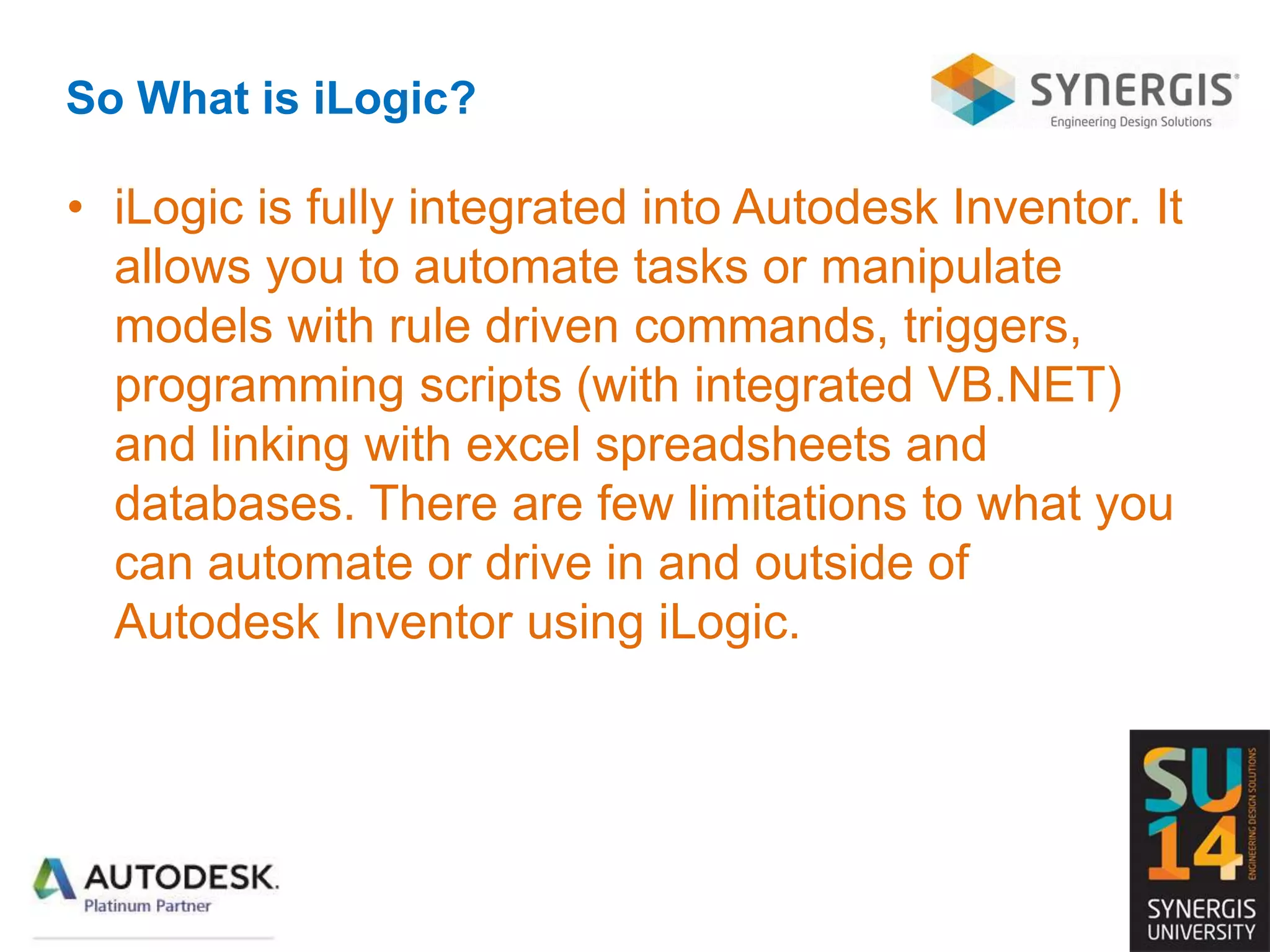 This document provides an overview of iLogic capabilities in Autodesk Inventor and Autodesk Configurator 360. It describes how iLogic allows users to automate tasks and manipulate models with logical expressions and programming scripts. It provides tips for effective use of iLogic, including starting with simple projects, using meaningful names, commenting rules, and seeking training. The document also describes Autodesk Configurator 360 as a tool for generating online configurable catalogs from Inventor models, allowing customization and control over deliverables and access.