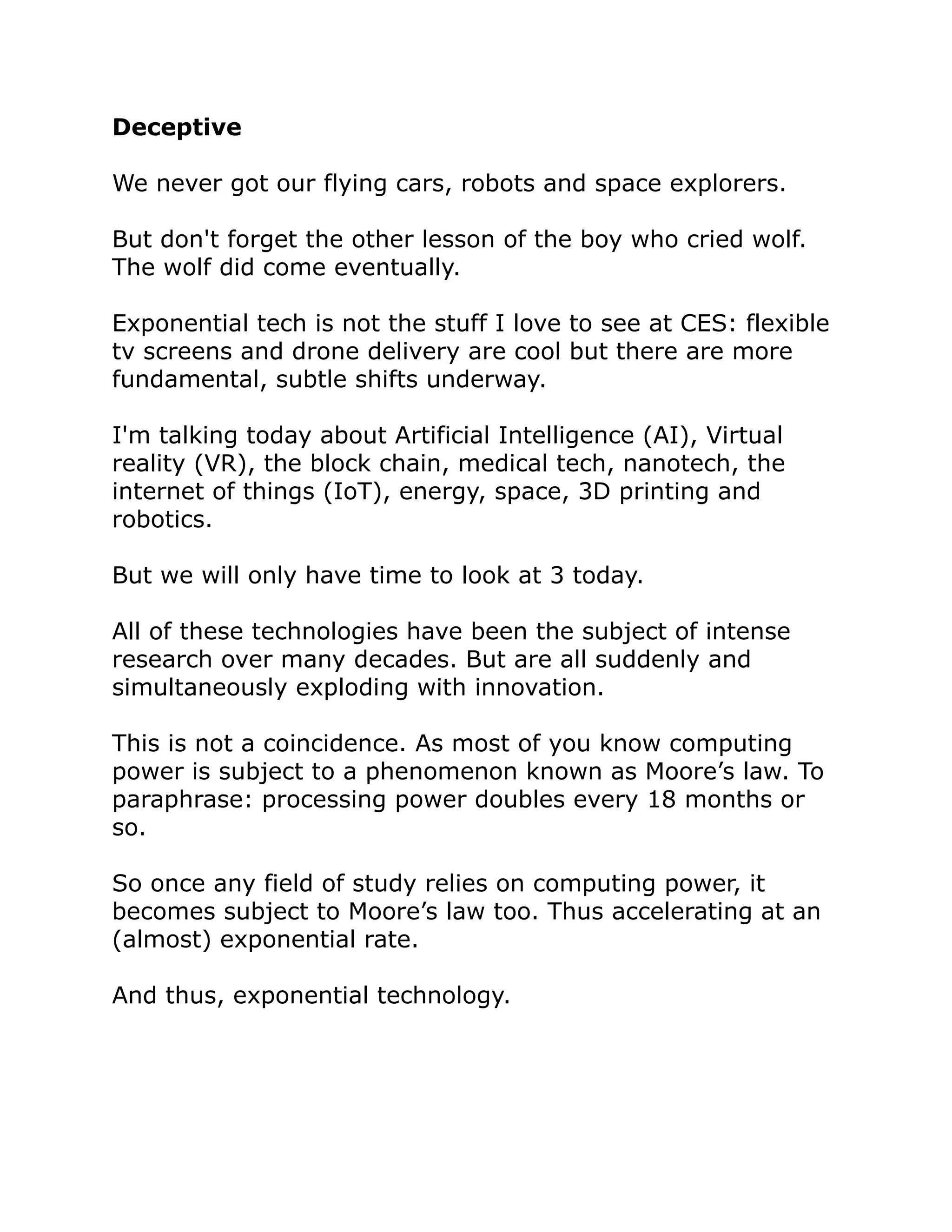 This document provides an overview and summary of a presentation about exponential technologies. The key points are: