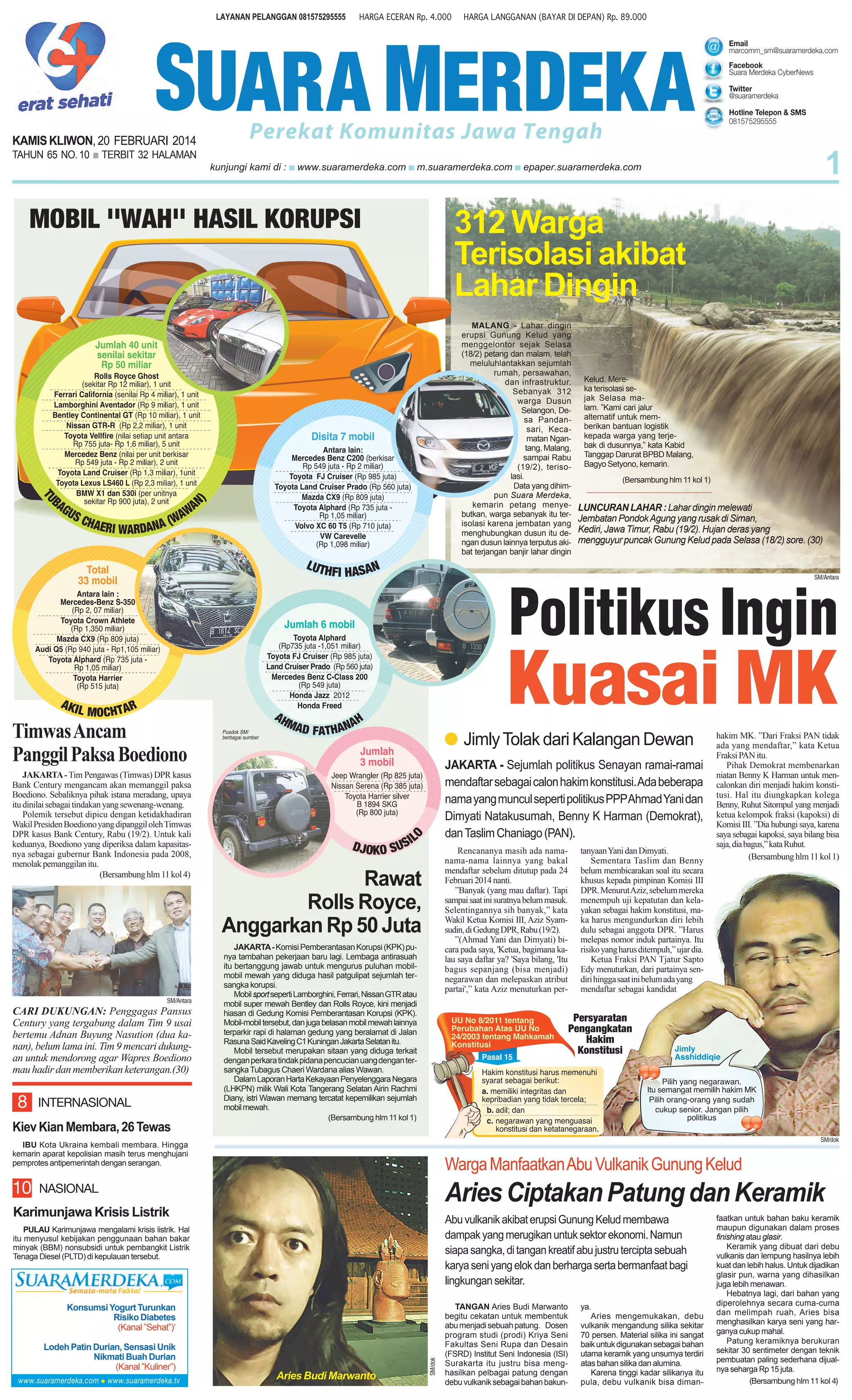 Erupsi Gunung Kelud menyebabkan lahar dingin meluluhlantakkan infrastruktur di Malang, mengisolasi 312 warga di Dusun Selangon. Tim pengawas DPR mengancam memanggil paksa Wakil Presiden Boediono terkait kasus bank century, sementara suasana politik di Surabaya antara Wali Kota Risma dan PDIP memanas. Di sisi lain, KPK mengkhawatirkan revisi KUHP dan KUHAP dapat mengancam keberlangsungan lembaga anti-korupsi itu.