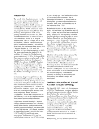 The document provides a critique of the Canadian government's policies around post-secondary education and innovation. It argues that while the economy has grown, funding for post-secondary education has declined significantly. It offers a detailed analysis of the government's policy papers on innovation and post-secondary education, arguing they have largely proposed only superficial solutions. It concludes by recommending changes to student loan programs and expressing criticism of using tax measures as a means of funding post-secondary institutions.