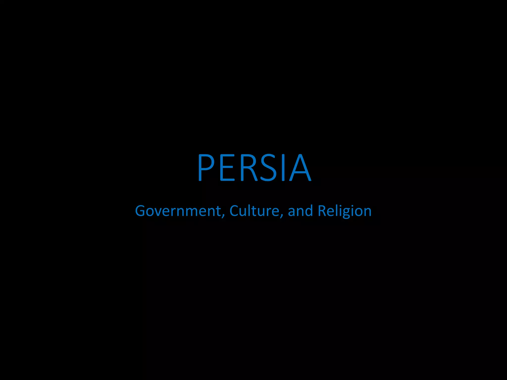 Ancient Persia had a large imperial bureaucracy that governed its vast empire from the Indus Valley to the Nile River. Bureaucrats were assigned to different provinces to administer on behalf of the king. The Persian government also built an extensive Royal Road system connecting major cities across the empire to facilitate communication and trade. Culturally, Persians followed a moral code emphasizing bravery, honesty and righteousness, and the dominant religion was Zoroastrianism which viewed the world as a battle between good and evil.