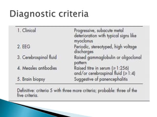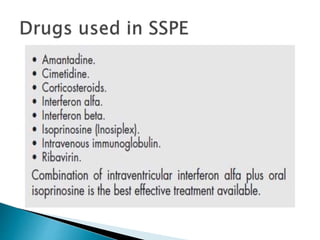 ii. Pathologically, it is characterized by neuronal inclusion bodies containing measles virus antigens. MRI may show non-specific white matter changes while EEG typically shows periodic complexes correlated with myoclonus. There is no cure and treatment is supportive only.