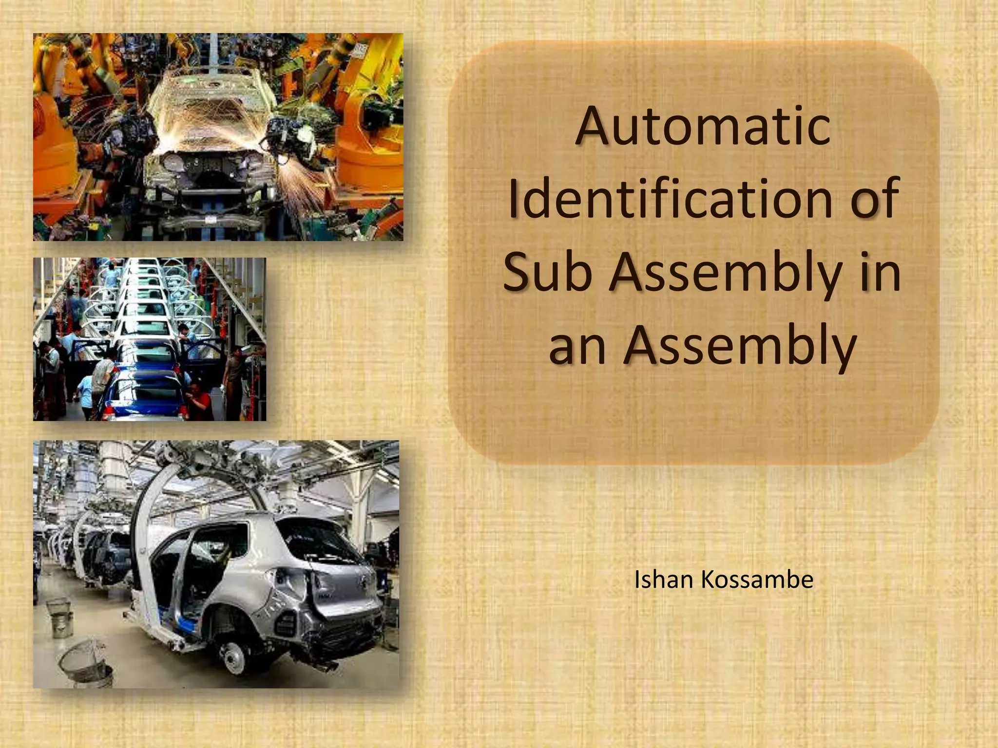 This document discusses automatic identification of sub-assemblies in an assembly. It begins with an introduction that defines assemblies and their hierarchical and complex nature. It then discusses the need for automatic sub-assembly identification to aid in assembly planning and reduce costs. The objectives are to extract information from a computer database, build liaisons, and develop an algorithm. The methodology section outlines generating a database of part mating relations and developing an algorithm to analyze the relations and identify sub-assemblies. The document concludes by noting benefits like reduced assembly costs and time through automation of sub-assembly identification.