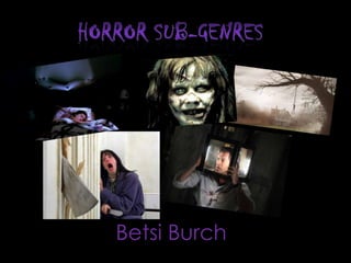The document discusses various horror movie subgenres and their common conventions. It provides descriptions of supernatural, slasher, possession, psychological, and gothic horror genres. It notes that the group chose to focus their promotional package on psychological horror since it allows more creative freedom than other subgenres with stricter conventions. They believe this will help them develop a fresh, original idea that stands out from current popular supernatural and possession movies. Their goal is to create a psychological horror film that becomes a cinematic classic like Silence of the Lambs and Gothika.