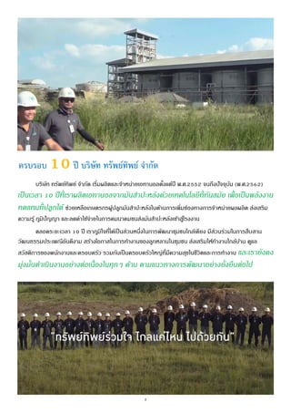 และชุมชนรอบข้าง เพื่อความยั่งยืนในอนาคต ภายใต้ปณิธานที่ว่า "สร้างคุณภาพพลังงานไทย ใส่ใจสิ่งแวดล้อม" ตลอดระยะเวลา 10 ปีที่ผ่านมา เราตระหนักและให้ความสาคัญของความรับผิดชอบต่อสังคมและสิ่งแวดล้อมอย่าง สม่าเสมอ เราดาเนินกิจกรรมเพื่อสังคมและรักษาสิ่งแวดล้อมควบคู่ไปกับการดาเนินงาน เพื่อลดผลกระทบสิ่งแวดล้อมและ ให้สังคมได้รับผลประโยชน์สูงสุด โดยหลักธรรมาภิบาลคานึงถึงผู้เกี่ยวข้องทุกฝ่าย ชุมชนใกล้เคียง เป็นมิตรกับสิ่งแวดล้อม พร้อมช่วยเหลือชุมชนและการพัฒนาชุมชนอย่างยั่งยืน และพัฒนาอย่างต่อเนื่องในด้านเทคโนโลยีที่สะอาด ทันสมัยและไม่ มีผลกระทบต่อสังคมและสิ่งแวดล้อม เพื่อมุ่งสู่การเป็นองค์กรที่มีประสิทธิภาพและสร้างสรรค์สังคมที่มีความสุข