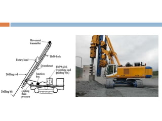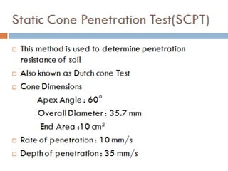 Subsoil exploration involves collecting soil data through field and laboratory investigations to assess soil properties at a site. The main objectives are to determine the nature, depth, thickness, and extent of soil strata as well as groundwater conditions and engineering properties. Methods include test pits, borings using augers or drilling, in-situ tests like SPT and CPT, and geophysical methods. Proper planning, execution, and reporting of the investigation are needed to provide reliable data to aid foundation design.